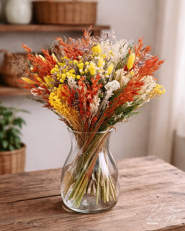 Bouquet de flores secas en tonos naranja, amarillo y crema.