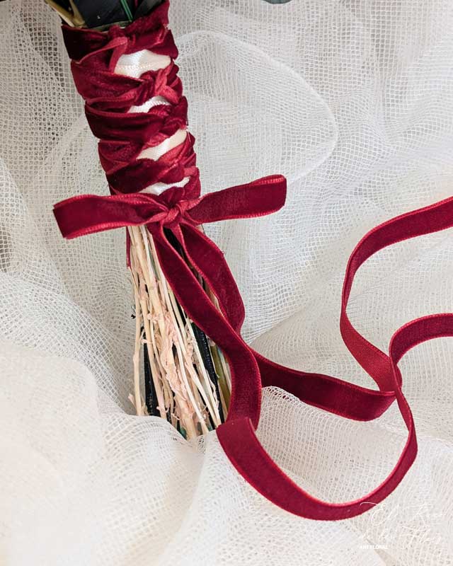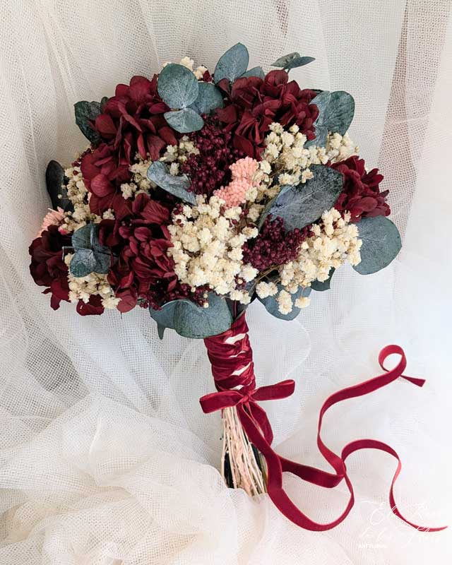 Elaborado con hortensia preservada granate, paniculata blanca preservada, achillea salvaje rosa y eucalipto gris preservado.
