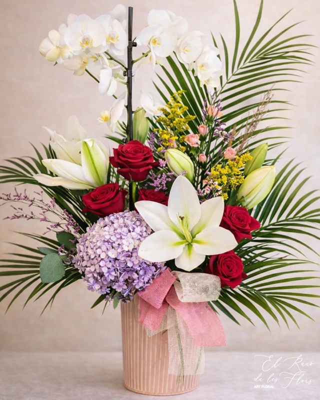 Compuesto por lilium blanco, rosa roja y orquídea en planta blanca.