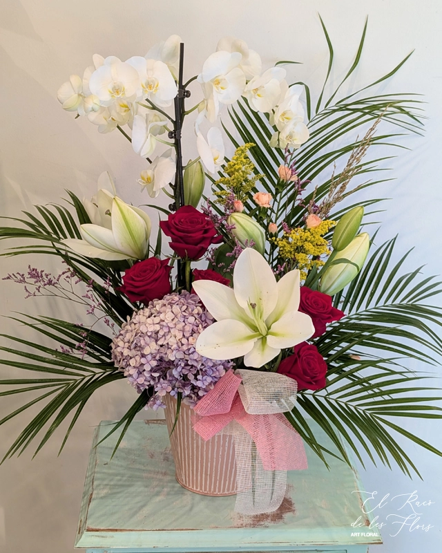 Centro de flores naturales y planta de orquídea.