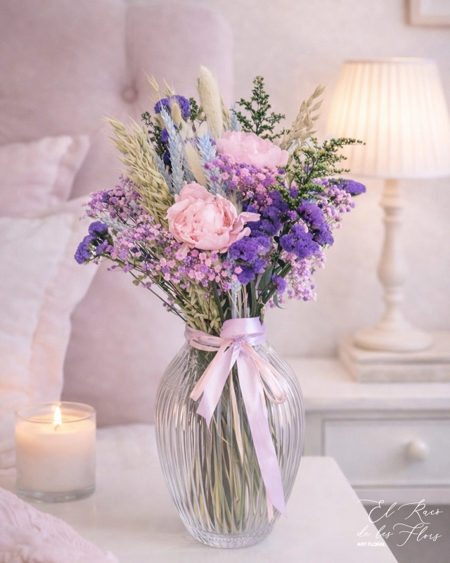 Materiales utilizados peonía rosa preservada, solidalgo, statice y panículata.