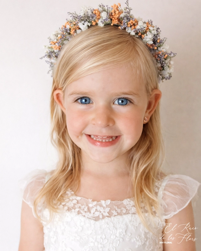 Diadema Clhoe, diadema de flor seca y preservada. En limonium lila, paniculata blanca, y toque de broom naranja.