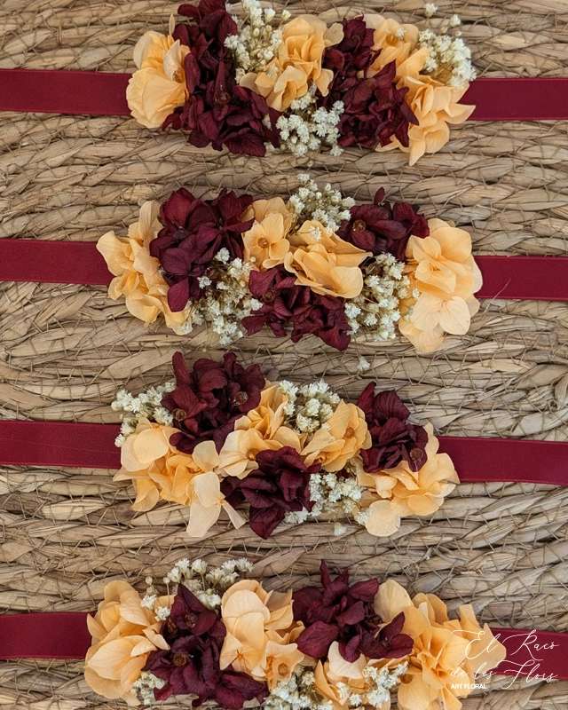 Pulsera frontal elaborada con hortensia granate, hortensia naranja y panículata.