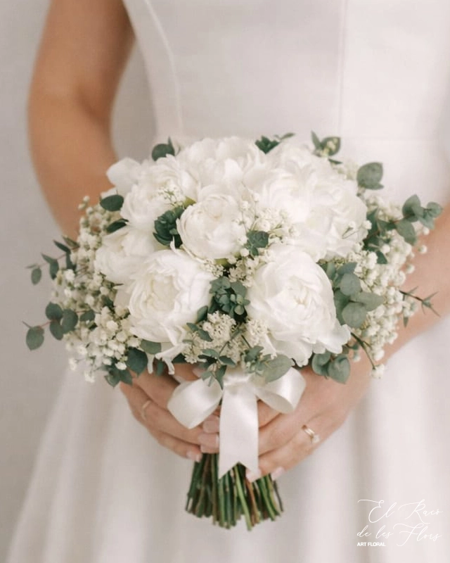 Ramo de novia de estilo romántico y muy elegante. Es un agrupado de peonías blancas preservadas junto con Hortensia preservada, eucalipto preservado y Limonium.