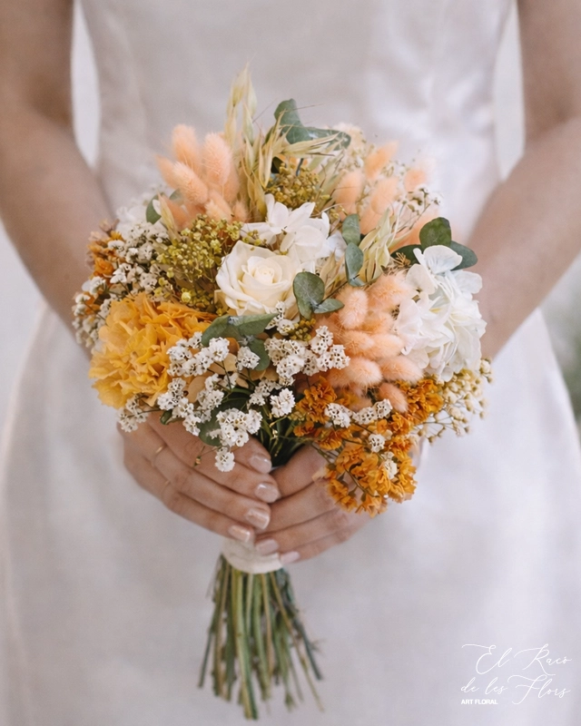 Ramo de novia con flor seca y preservada, en tonos crema, naranja y salmón. Compuesto por hortensia naranja, avena natural, una rosa crema, phalaris salmón, statice naranja, paniculata verde, eucalipto usa gris, hortensia blanca, limonium blanco.