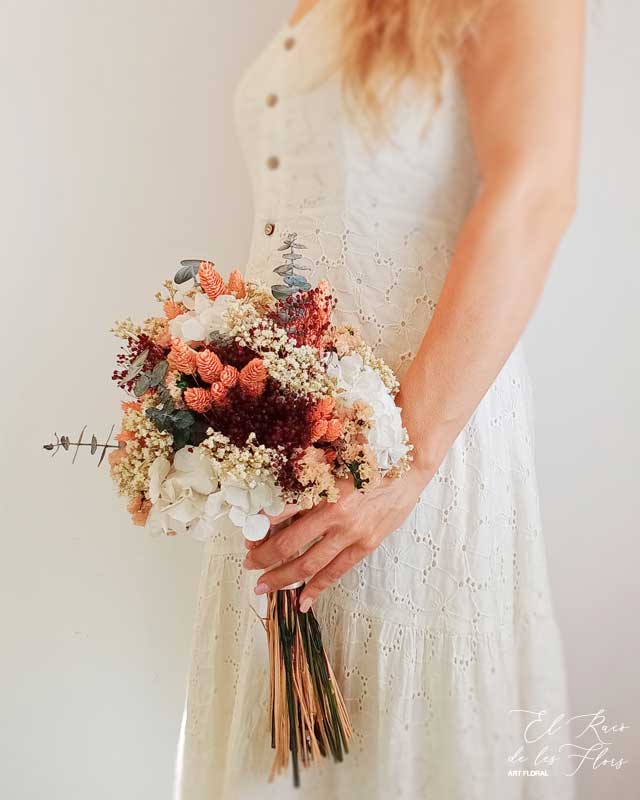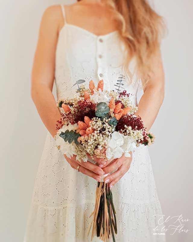 Ramo de novia en flores secas y preservadas en tonos blanco, granate y salmón.